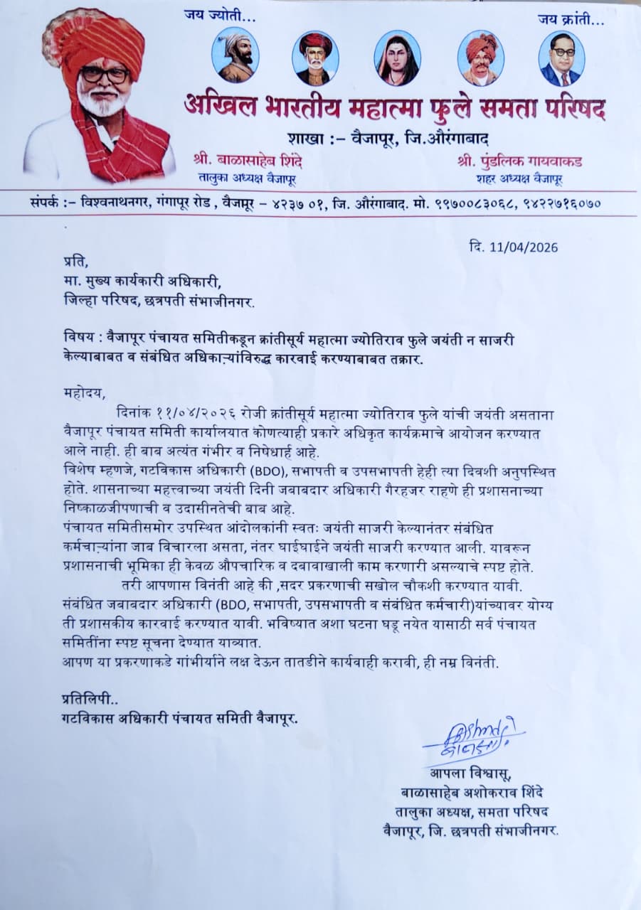 फुले जयंती पर वैजापुर पंचायत समिति में लापरवाही, कार्रवाई की मांग तेज...