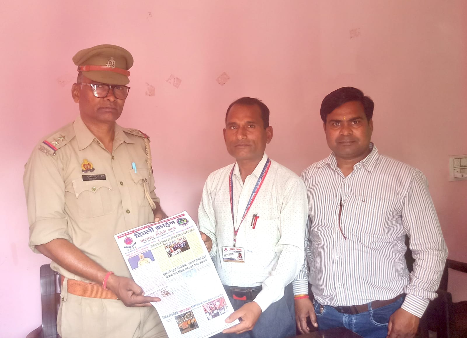 दिल्ली क्राइम प्रेस टीम लीडर सत्येंद्र सैनी थाना सिविल लाइन में न्यूज़ पेपर की कॉपी देते हुए