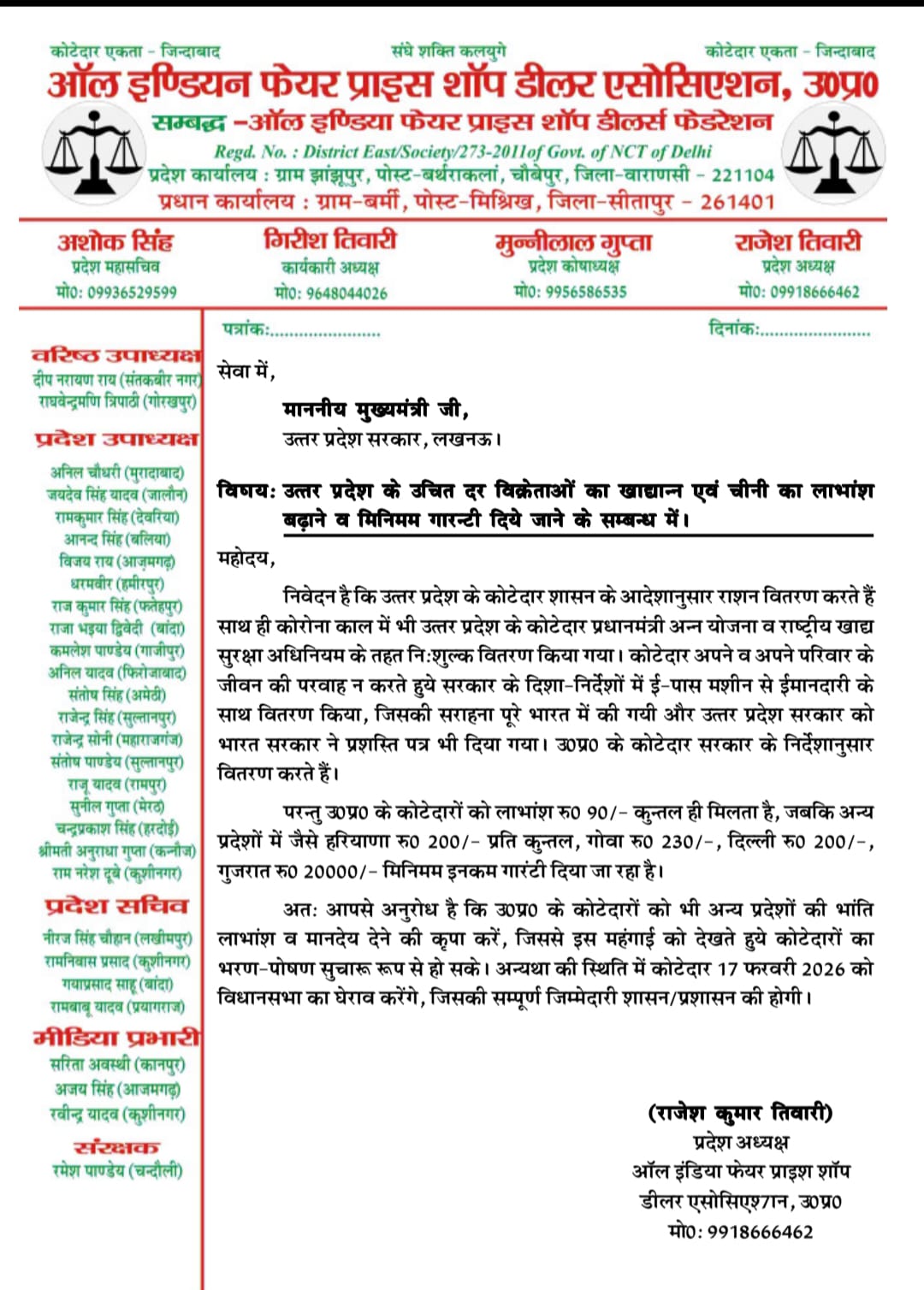 उत्तर प्रदेश के उचित दर विक्रेताओं ने सरकार को स्पष्ट चेतावनी देते हुए कहा है कि यदि उनकी लंबित मांगों पर शीघ्र निर्णय नहीं लिया गया, तो वे 17 फरवरी से विधानसभा का घेराव करेंगे। यह चेतावनी ऑल इंडिया फेयर प्राइस शॉप डीलर एसोसिएशन, उत्तर प्रदेश द्वारा दी गई है।