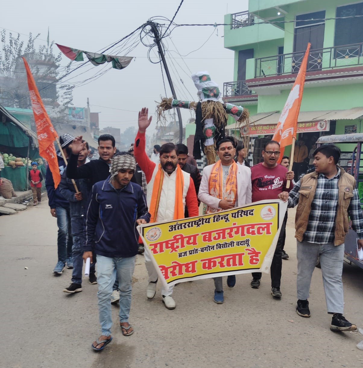 बगरैन (बदायूं)। बगरैन चौराहे पर अंतरराष्ट्रीय हिंदू परिषद–राष्ट्रीय बजरंग दल के कार्यकर्ताओं ने